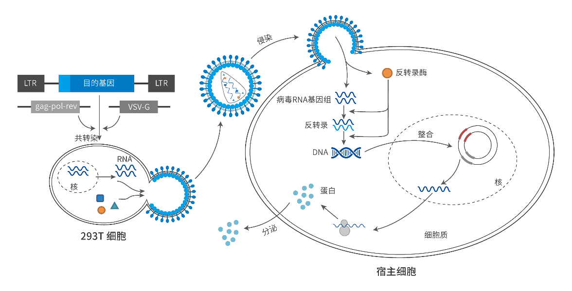 Lentiviruses are a type of viral vector modified from human immunodeficiency virus (HIV). They are a type of retrovirus with an RNA genome. Their virulence genes have been knocked out and replaced by exogenous target genes. Belonging to the pseudovirus family , they can integrate exogenous genes into their genome for stable expression and can infect both dividing and non-dividing cells. After entering the cell, the lentiviral genome is reverse transcribed into DNA in the cytoplasm, forming a pre-integration DNA complex. Upon entering the nucleus, the DNA integrates into the cell genome. The integrated DNA is transcribed into mRNA, returns to the cytoplasm, and expresses the target protein or produces small RNA. Lentivirus- mediated gene expression or small RNA interference is persistent and stable, and occurs with cell division (Figure 1).